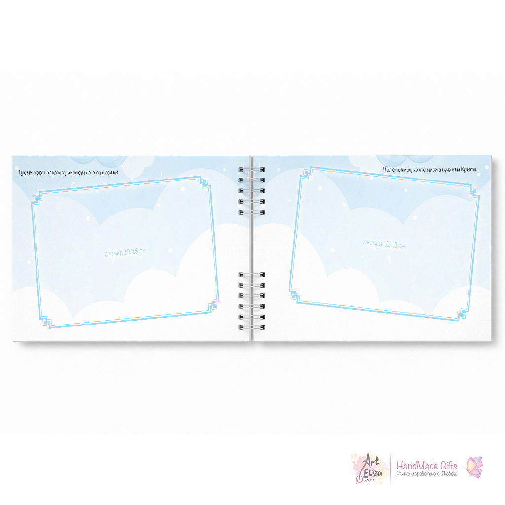 Албумът предлага специално оформени страници за снимки и лични бележки, които ще превърнат всяка страница в ценен спомен. Идеален както за лично ползване, така и като подарък за кръщене, който ще се пази цял живот.