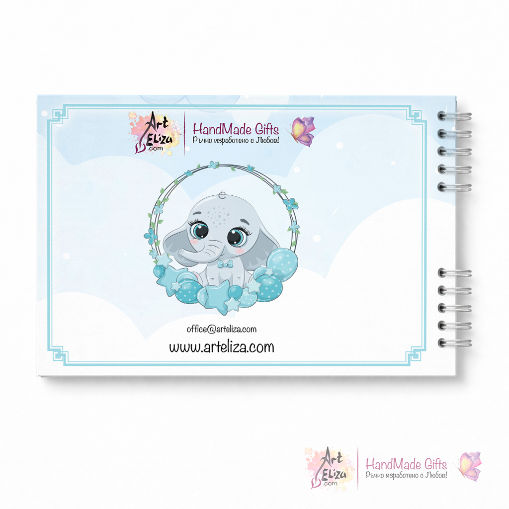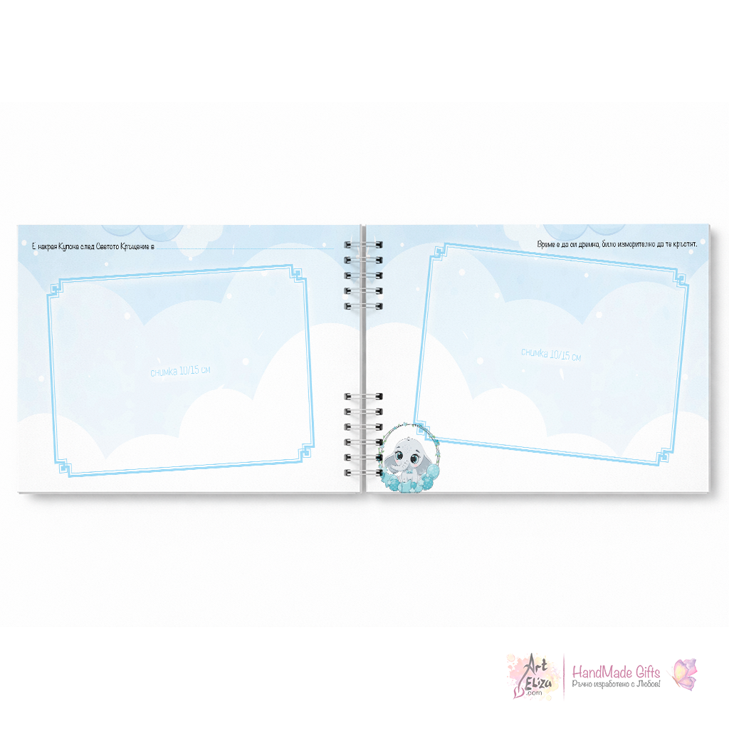 Съхранете най-красивите мигове от Светото кръщение с този нежен и стилен албум за момченце. С очарователен дизайн със слонче и цветя, той е създаден, за да запази спомените от този специален ден – снимки с мама и тати, кръстници, първите емоции и незабравимите моменти.